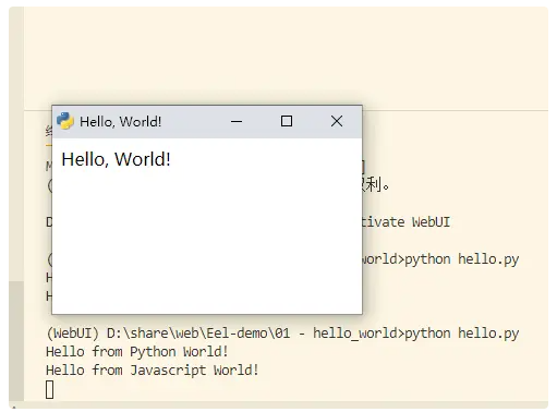 eel.start('hello.html') # Start (this blocks and enters loop)如果我们运行 Python 脚本(python hello.py),则会打开一个浏览器窗口,显示hello.html: